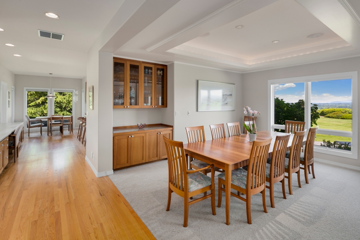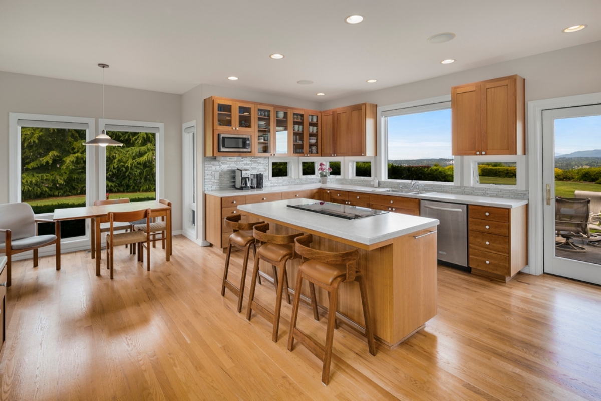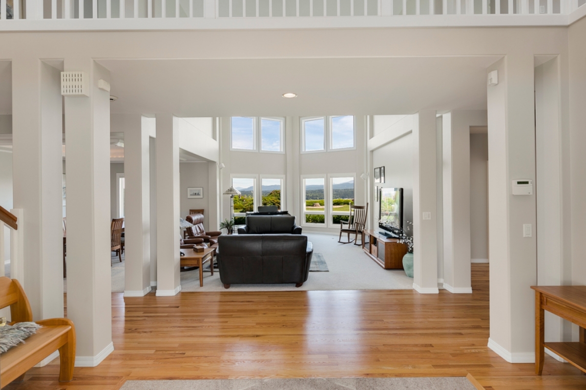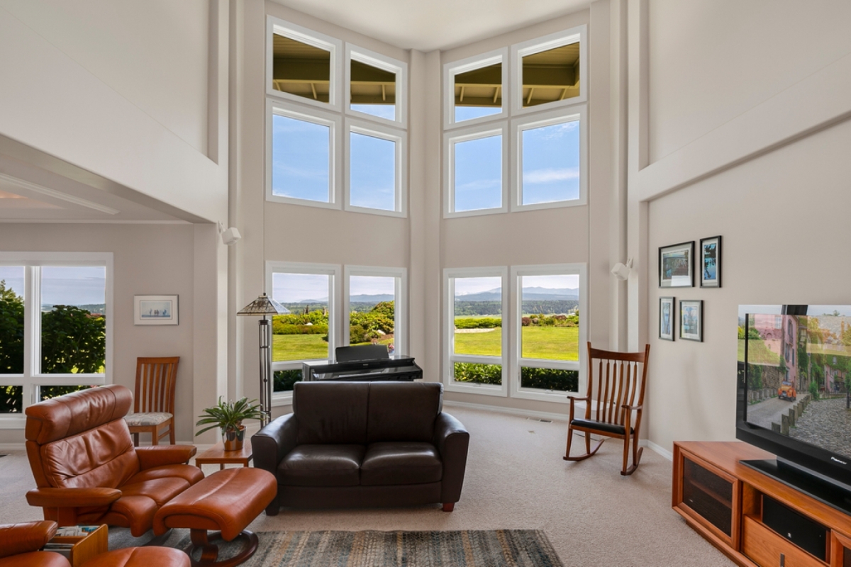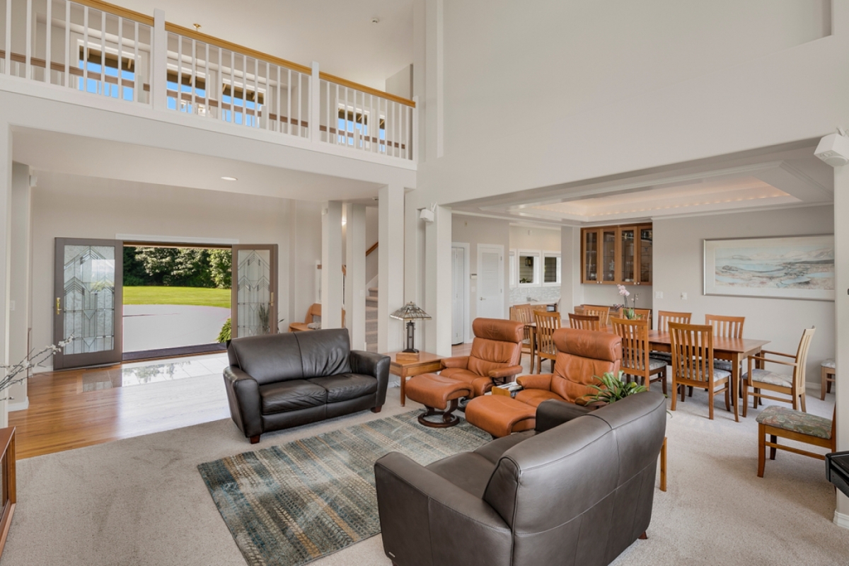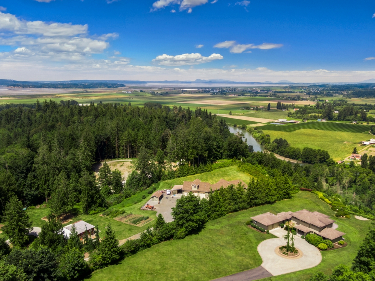 Overlooking the Stillaguamish River, the owners of this home enjoy it both inside and out. A garden is surrounded by a large circular driveway that leads to a 2 car garage with a mudroom and laundry room separating it from the house. At the front entrance stand two custom crafted columns before entering the home. Once inside, the home opens up with vaulted ceilings from the foyer to the living area. Lots of light is let in through the 4 large windows with views to the valley below. A second floor bridge is also seen that joins the two upstairs bedrooms and bathrooms. Just behind the living area is the dinning area with recessed lighting and windows as well. The kitchen area has plenty of counter space, a pantry, and windows that also look out to the yard and valley. On the opposite end of the home is the master bedroom. This room has patio access to the backyard and the large master bath.
